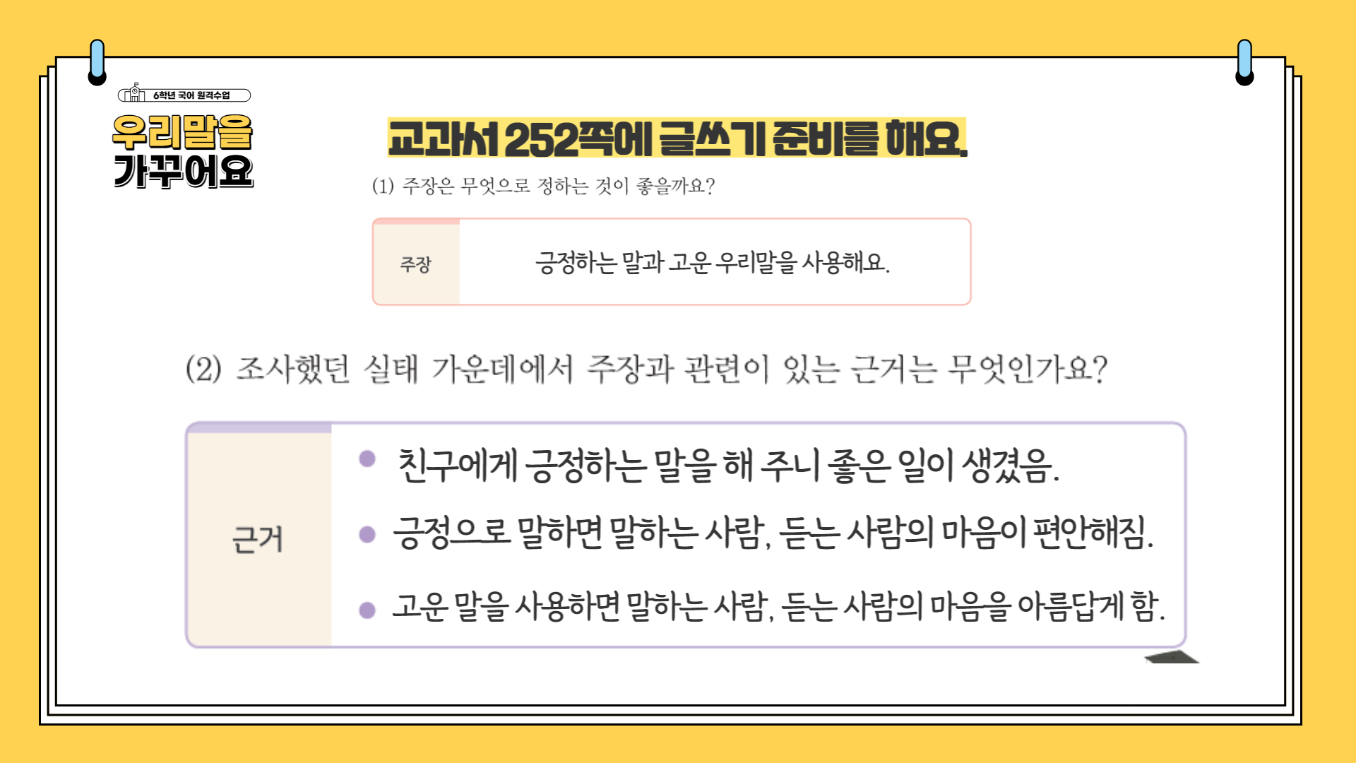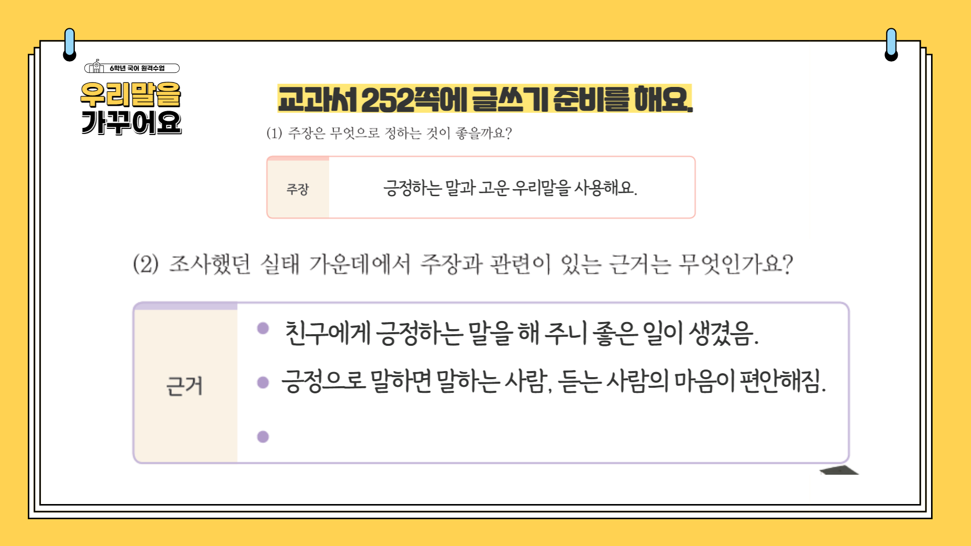 - [긍정의 말의 힘] 영상을 보고 논설문의 특징을 다시 배우며 교과서 251, 252쪽 글쓰기 준비하기