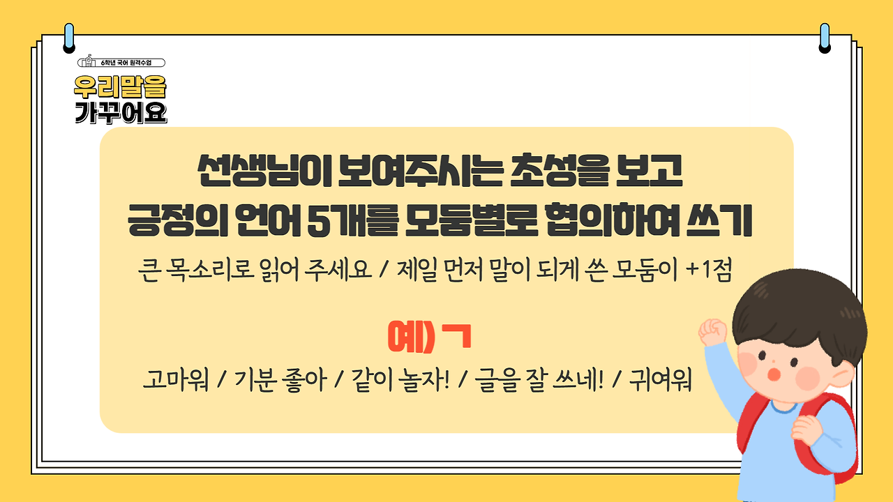 1) 선생님이 보여주시는 초성을 보고 긍정의 언어 5개를 모둠별로 협의하여 쓰기