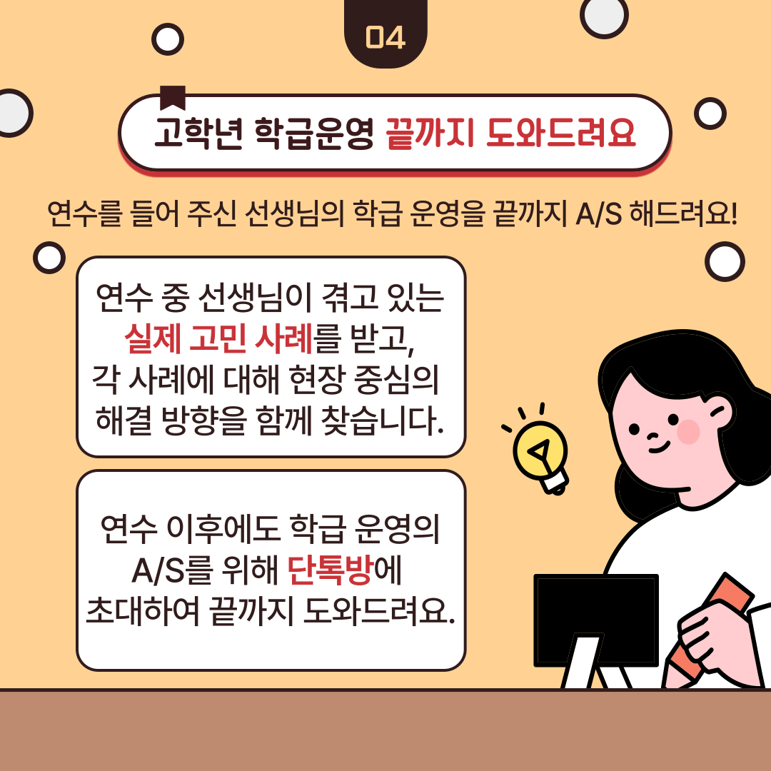 ✔ 연수 중 접수된 선생님들의 고민에 끝까지 답을 찾는 과정으로 구성됩니다.